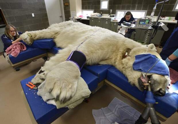 Смотря на такого большого хищника как белый медведь, задумывались ли вы как с ним работают люди, например ветеринары во время медицинского осмотра, ведь такой мишка может одним ударом лапы прекратить существование врача раз и навсегда.